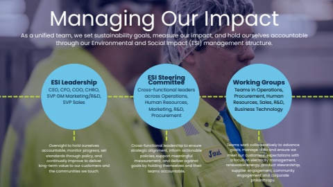 Managing Our ImpactAs a unified team, we set sustainability goals, measure our impact, and hold ourselves accountable through our Environmental and Social Impact (ESI) management structure. CEO, CFO, COO, CHRO, SVP GM Marketing/R&D, SVP SalesCross-functional leaders across Operations, Human Resources, Marketing, R&D, ProcurementTeams in Operations, Procurement, Human Resources, Sales, R&D, Business TechnologyESI LeadershipESI Steering Committee Working GroupsOversight to hold ourselves accountable, monitor progress, set standards through policy, and continually improve to deliver long-term value to our customers and the communities we touch. Cross-functional leadership to ensure strategic alignment, inform actionable policies, support meaningful measurement, and deliver against goals by holding themselves and their teams accountable.Teams work collaboratively to advance goals, manage data and ensure we meet our customers%u2019 expectations with a focus on electricity management, renewable energy, product stewardship, supplier engagement, community engagement and corporate philanthropy.