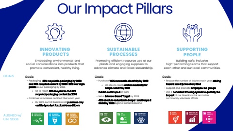 Our Impact PillarsALIGNED w/U.N. SDGsGOALSINNOVATING PRODUCTSEmbedding environmental and social considerations into products that promote convenient, healthy living.Goals: %u2022 Packaging: 25% recyclable packaging by 2030 and 30% recycled content by 2030; 25% less virgin plastic in our packaging by 2025 %u26ac UK to reach 90% recyclable and 30% recycled packaging content by 2030%u2022 Continue to increase certified fiber each year%u26ac By 2026, our UK business will purchase only certified product for plant-based fibersSUSTAINABLE PROCESSESPromoting efficient resource use at our plants and engaging suppliers toadvance climate and forest stewardship.Goals: %u2022 Purchase 100% renewable electricity by 2030%u26ac UK sites to reach carbon neutrality for Scope 1 and 2 by 2030 %u2022 Publish our Scope 3 in 2026%u2022 Set a Science-Based Target by 2028%u2022 42% absolute reduction in Scope 1 and Scope 2 GHGS by 2030 against a 2020 baseline SUPPORTING PEOPLEBuilding safe, inclusive,high-performing teams that support each other and our local communities.Goals: %u2022 Reduce the number of injuries each year, striving toward zero injuries of any kind%u2022 Support and promote employee-led groups%u2022 Use a consistent tracking system to quantify the impact of our Give Back Pak and other community volunteer efforts
