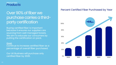 Over 90% of fiber we purchase carries a thirdparty certificationPercent Certified Fiber Purchased by YearBuying certified fiber is important because it ensures our suppliers are sourcing from well managed forests. We aim to educate our consumers by putting the certification on pack.Goal: Continue to increase certified fiber as a percentage of overall fiber purchased.Our UK Business will purchase only certified fiber by 2026.INNOVATINGProducts17+66pts
