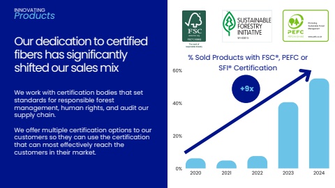 % Sold Products with FSC%u00ae, PEFC or SFI%u00ae CertificationWe work with certification bodies that set standards for responsible forest management, human rights, and audit our supply chain.We offer multiple certification options to our customers so they can use the certification that can most effectively reach the customers in their market. Our dedication to certified fibers has significantly shifted our sales mixINNOVATINGProducts+9x
