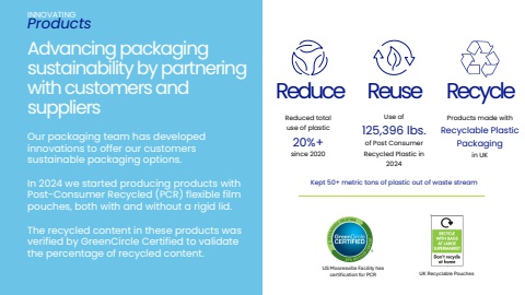 Our packaging team has developed innovations to offer our customers sustainable packaging options. In 2024 we started producing products with Post-Consumer Recycled (PCR) flexible film pouches, both with and without a rigid lid. The recycled content in these products was verified by GreenCircle Certified to validate the percentage of recycled content. Kept 50+ metric tons of plastic out of waste streamUK Recyclable PouchesUS Mooresville Facility has certification for PCRINNOVATINGProductsReduce Reuse RecycleReduced total use of plasticsince 202020%+ of Post Consumer Recycled Plastic in 2024125,396 lbs.Use of Products made within UKRecyclable Plastic PackagingAdvancing packaging sustainability by partnering with customers and suppliers