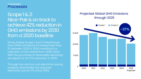 Gross Global Scope 1 and 2 Greenhouse Gas (GHG) emissions increased less than 1% between 2023 & 2024, resulting in a reduction of 12% overall from 2020-2024. With the purchase of renewable electricity, we expect to hit 27% reduction in 2025. Through low and no cost electricity saving projects, Mooresville has reduced electricity use by 17% since 2020.Projected Global GHG Emissionsthrough 2025SUSTAINABLEProcessesScope 1 & 2:Nice-Pak is on track to achieve 42% reduction in GHG emissions by 2030 from a 2020 baselineProjected-27%