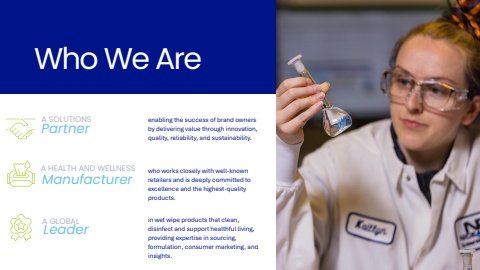A SOLUTIONS enabling the success of brand owners by delivering value through innovation, quality, reliability, and sustainability.PartnerWho We AreA HEALTH AND WELLNESSManufacturerwho works closely with well-known retailers and is deeply committed to excellence and the highest-quality products.A GLOBAL in wet wipe products that clean, disinfect and support healthful living, providing expertise in sourcing, formulation, consumer marketing, and insights.Leader